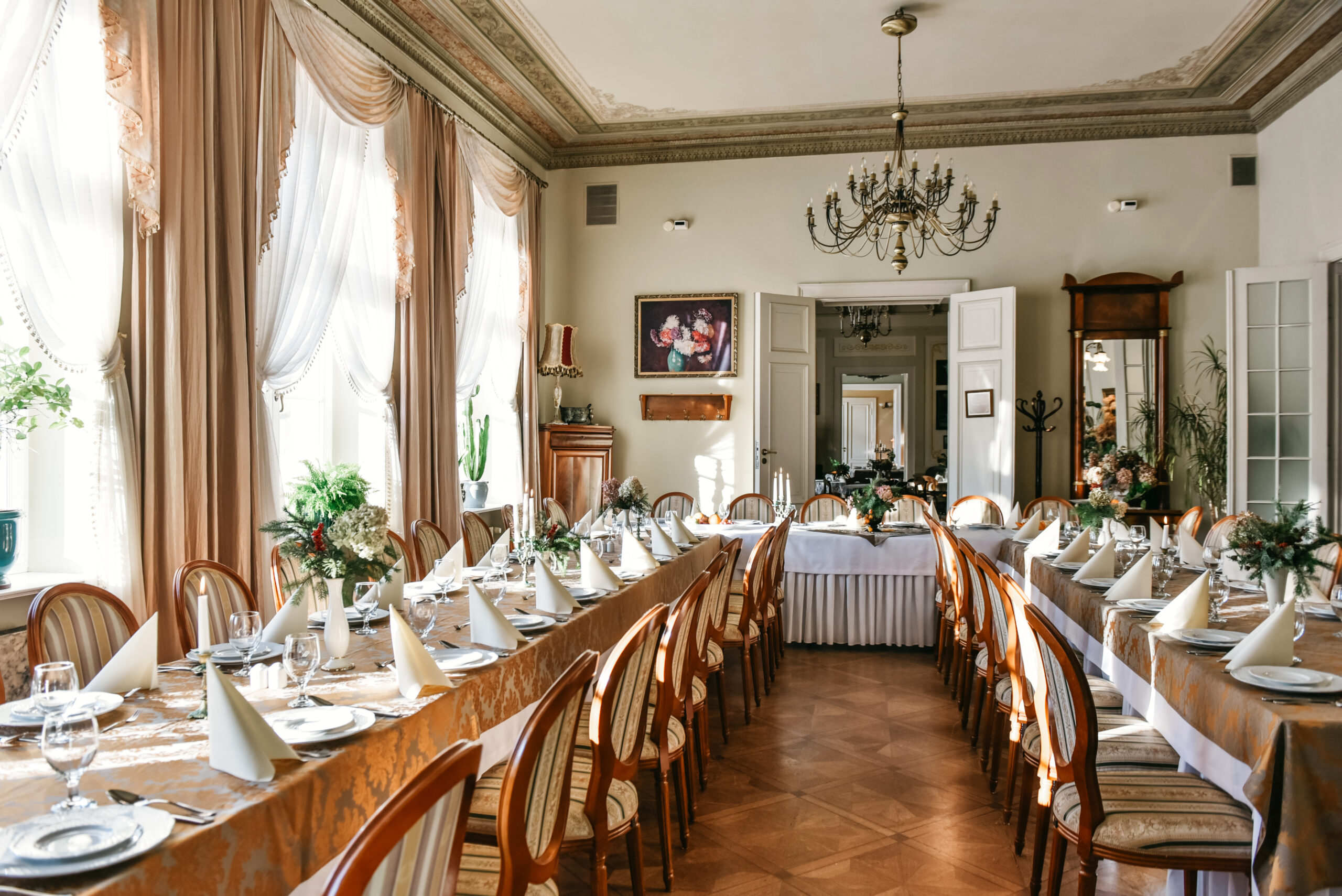 Sala balowa idealnie sprawdza się podczas wesel i uroczystości tanecznych do 50 osób, a w układzie bankietowym lub kolacyjnym może komfortowo ugościć do 70 osób. Dla mniejszych spotkań proponujemy bardziej intymne przestrzenie – przytulny wykusz dla 6 osób czy zamykany Salonik Włoski dla około 10 Gości, zapewniający prywatność i wyjątkową atmosferę rodzinnego stołu.